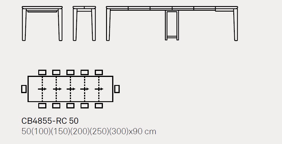 • Chiuso 90 x 50, allungato 90×100, 90×150, 90×200, 90×250 e 90x300cm