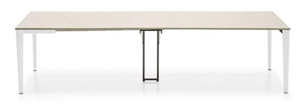 La larghezza della consolle Artic è di 90cm, mentre da chiusa la profondità è di soli 50cm. Le allunghe sono 5, tutte della stessa misura, ovvero da 50cm ciascuna, che permettono di creare tavoli da 4 fino a 12 posti. Nascosta sotto alla struttura principale c’è poi una gamba supplementare di sostegno che si ripiega quando non serve.