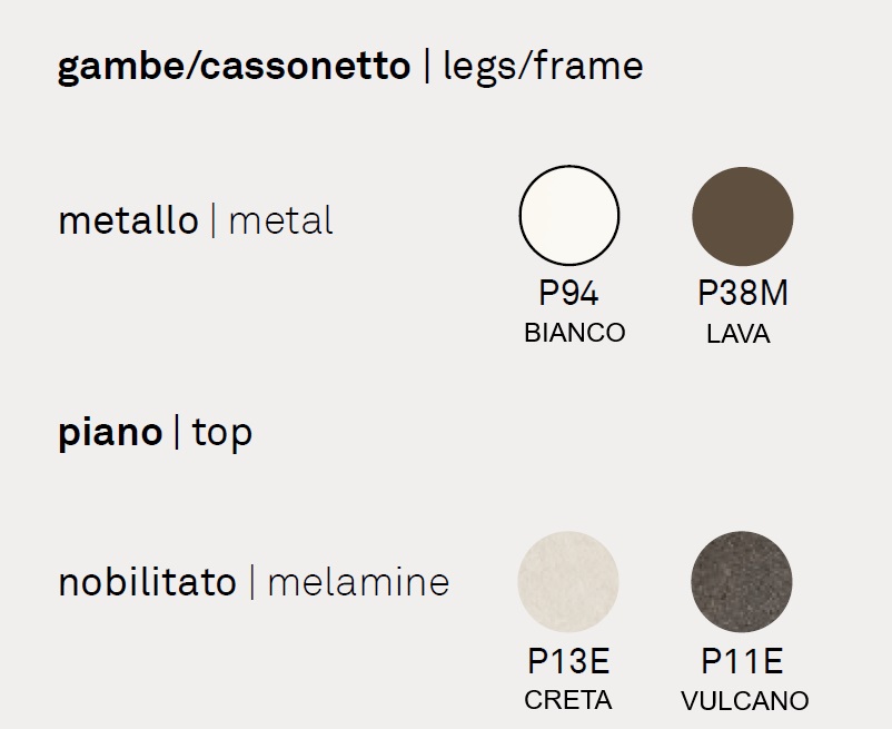 La consolle Artic si può avere con il telaio in metallo in 2 colori, bianco ottico opaco o lava opaco e il piano abbinato in Nobilitato finitura Creta o Vulcano.